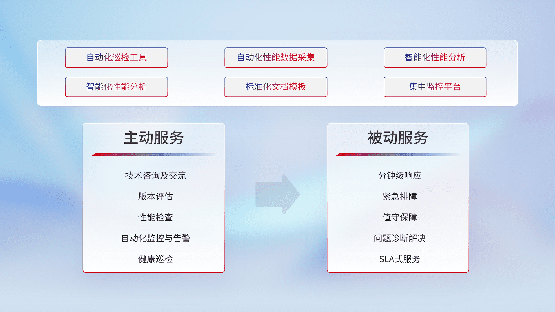 智能化工具和标准化文档,,,保障服务质量,,,提供主动服务(包含技术咨询、、、版本评估、、、、性能检查、、自动化监控与告警、、、、健康巡检)和被动服务包含(分钟级响应、、、紧急排障、、、、值守保障、、问题诊断解决、、、、SLA服务)。。。
